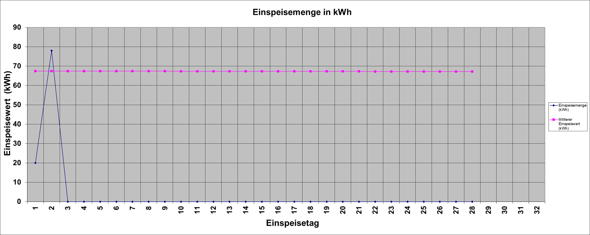 | Einspeisemenge (kWh) | 20 | 78 | 0 | 0 | 0 | 0 | 0 | 0 | 0 | 0 | 0 | 0 | 0 | 0 | 0 | 0 | 0 | 0 | 0 | 0 | 0 | 0 | 0 | 0 | 0 | 0 | 0 | 0 | |||||