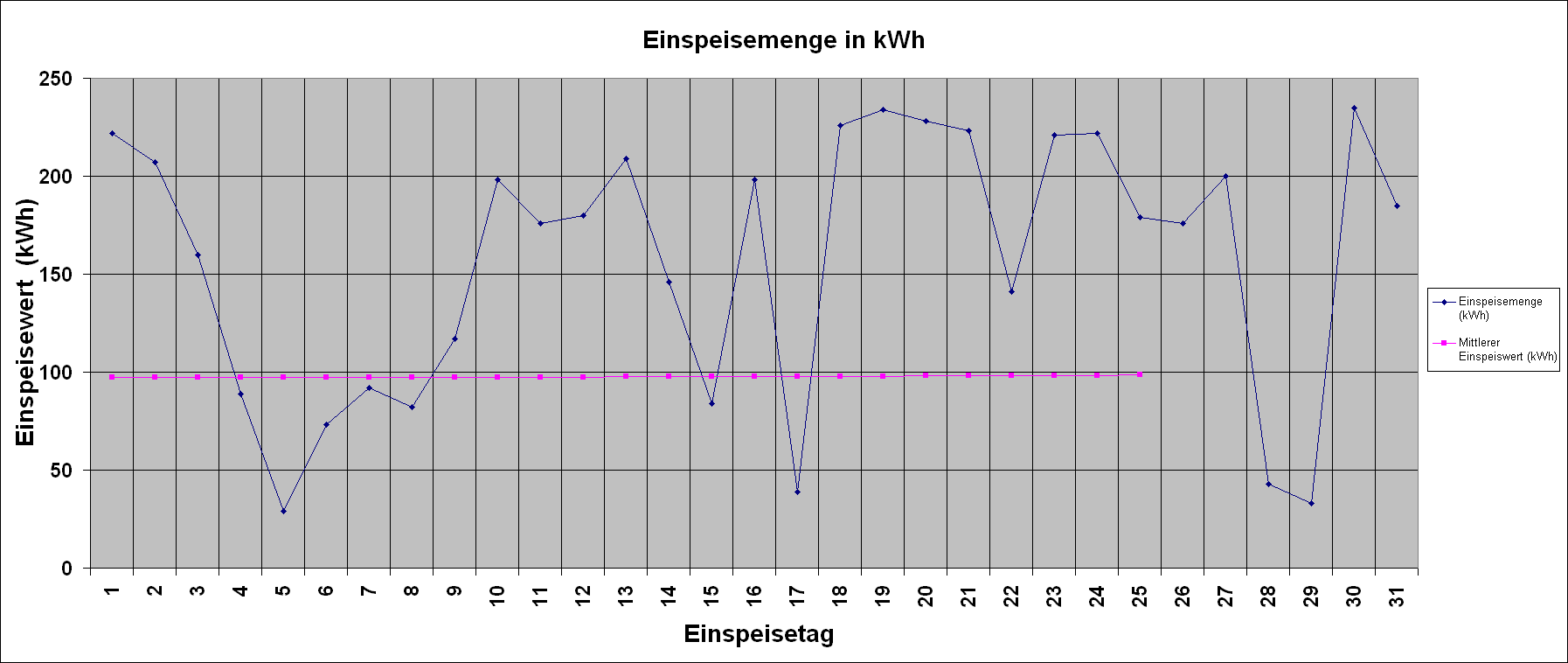 | Einspeisemenge (kWh) | 222 | 207 | 160 | 89 | 29 | 73 | 92 | 82 | 117 | 198 | 176 | 180 | 209 | 146 | 84 | 198 | 39 | 226 | 234 | 228 | 223 | 141 | 221 | 222 | 179 | 176 | 200 | 43 | 33 | 235 | 185 | |