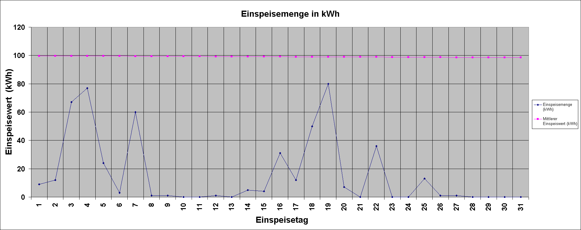| Einspeisemenge (kWh) | 0 | 0 | 3 | 75 | 15 | 24 | 24 | 66 | 70 | 2 | 0 | 0 | 0 | 0 | 0 | 7 | 14 | 65 | 15 | 93 | 124 | 74 | 100 | 100 | 111 | 100 | 126 | 108 | ||||