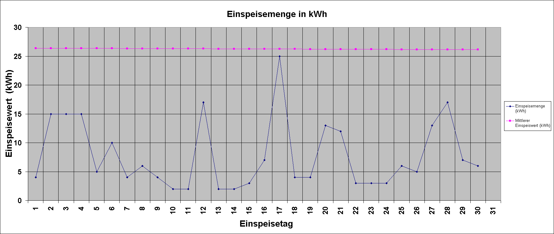 | Einspeisemenge (kWh) | 4 | 15 | 15 | 15 | 5 | 10 | 4 | 6 | 4 | 2 | 2 | 17 | 2 | 2 | 3 | 7 | 25 | 4 | 4 | 13 | 12 | 3 | 3 | 3 | 6 | 5 | 13 | 17 | 7 | 6 | ||
