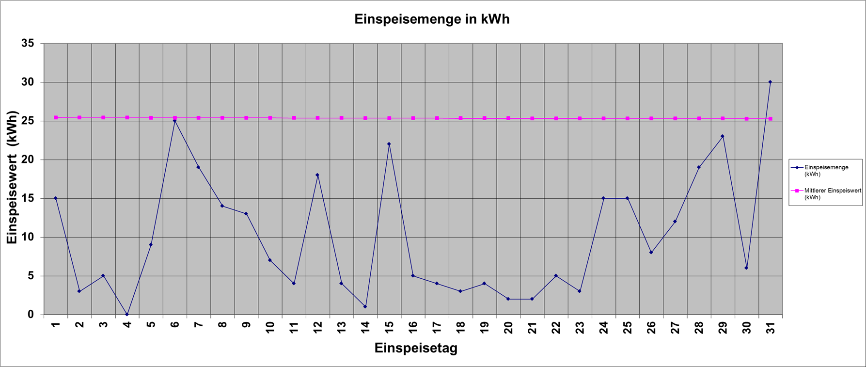 | Einspeisemenge (kWh) | 15 | 3 | 5 | 0 | 9 | 25 | 19 | 14 | 13 | 7 | 4 | 18 | 4 | 1 | 22 | 5 | 4 | 3 | 4 | 2 | 2 | 5 | 3 | 15 | 15 | 8 | 12 | 19 | 23 | 6 | 30 | ||