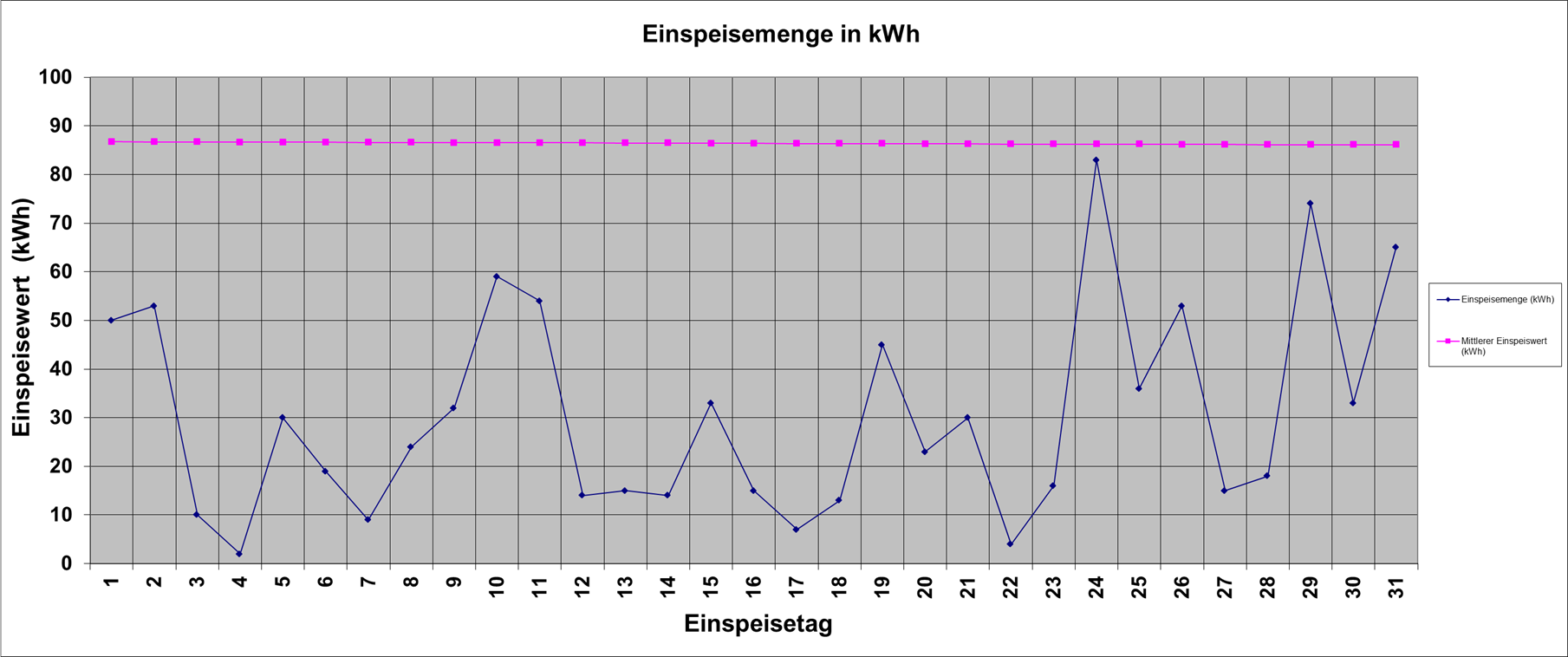 | Einspeisemenge (kWh) | 50 | 53 | 10 | 2 | 30 | 19 | 9 | 24 | 32 | 59 | 54 | 14 | 15 | 14 | 33 | 15 | 7 | 13 | 45 | 23 | 30 | 4 | 16 | 83 | 36 | 53 | 15 | 18 | 74 | 33 | 65 | |
