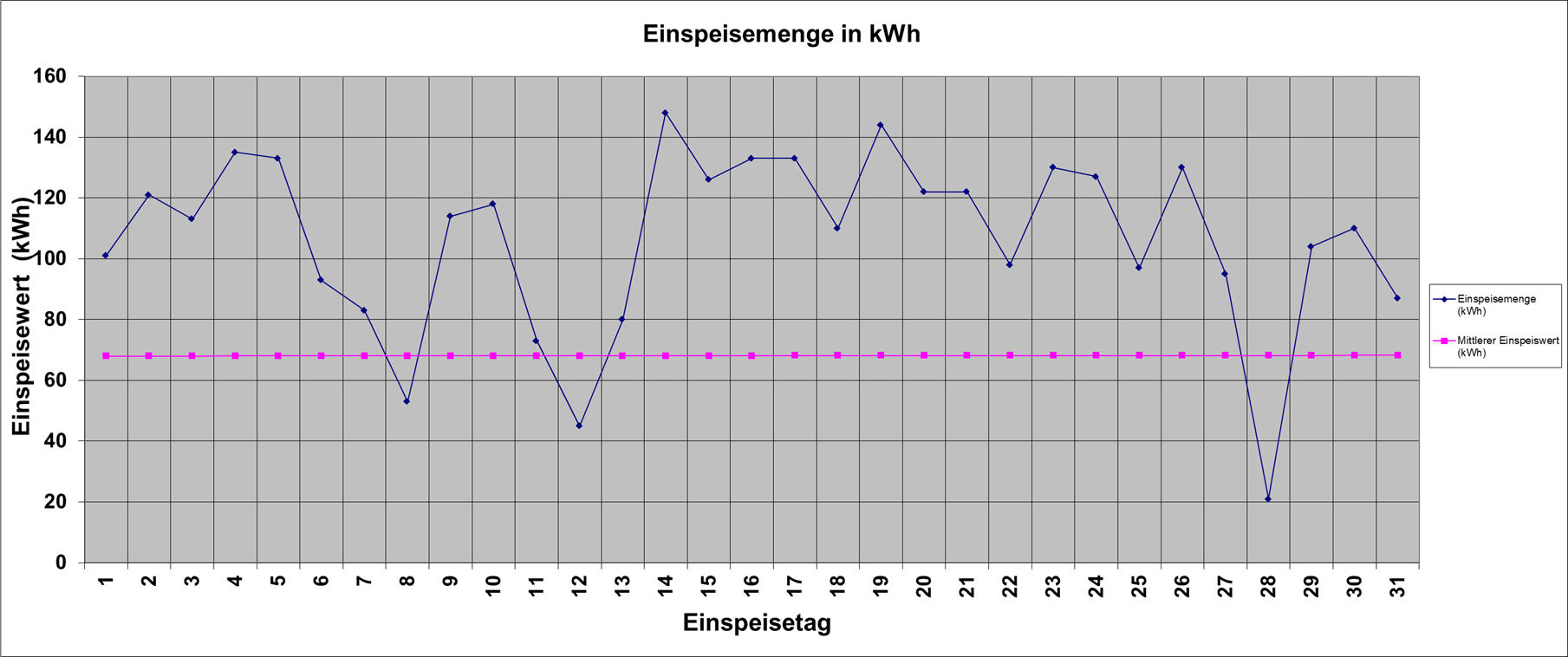 | Einspeisemenge (kWh) | 101 | 121 | 113 | 135 | 133 | 93 | 83 | 53 | 114 | 118 | 73 | 45 | 80 | 148 | 126 | 133 | 133 | 110 | 144 | 122 | 122 | 98 | 130 | 127 | 97 | 130 | 95 | 21 | 104 | 110 | 87 | |