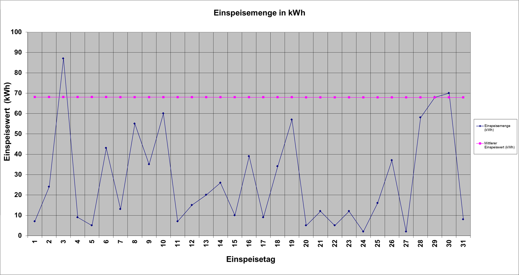 | Einspeisemenge (kWh) | 7 | 24 | 87 | 9 | 5 | 43 | 13 | 55 | 35 | 60 | 7 | 15 | 20 | 26 | 10 | 39 | 9 | 34 | 57 | 5 | 12 | 5 | 12 | 2 | 16 | 37 | 2 | 58 | 68 | 70 | 8 | |