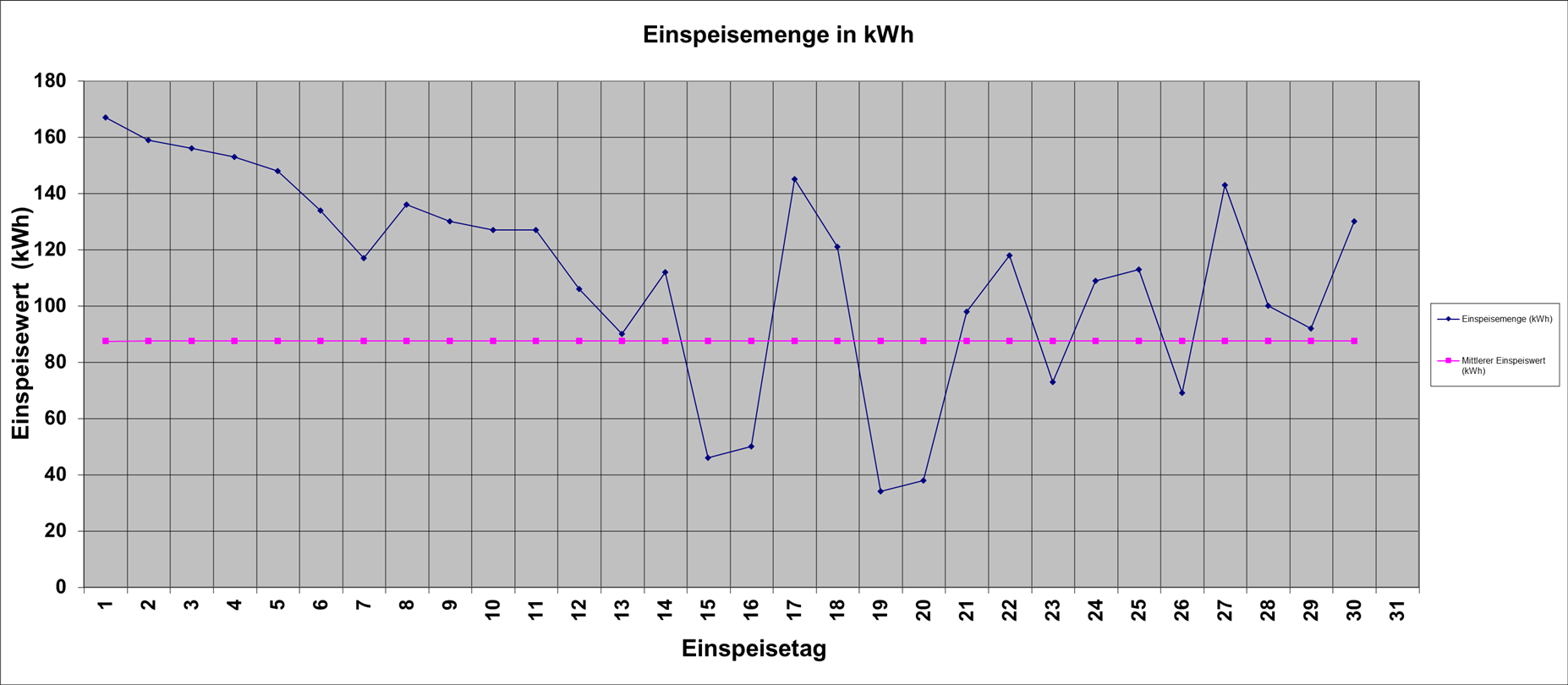 | Einspeisemenge (kWh) | 167 | 159 | 156 | 153 | 148 | 134 | 117 | 136 | 130 | 127 | 127 | 106 | 90 | 112 | 46 | 50 | 145 | 121 | 34 | 38 | 98 | 118 | 73 | 109 | 113 | 69 | 143 | 100 | 92 | 130 | ||