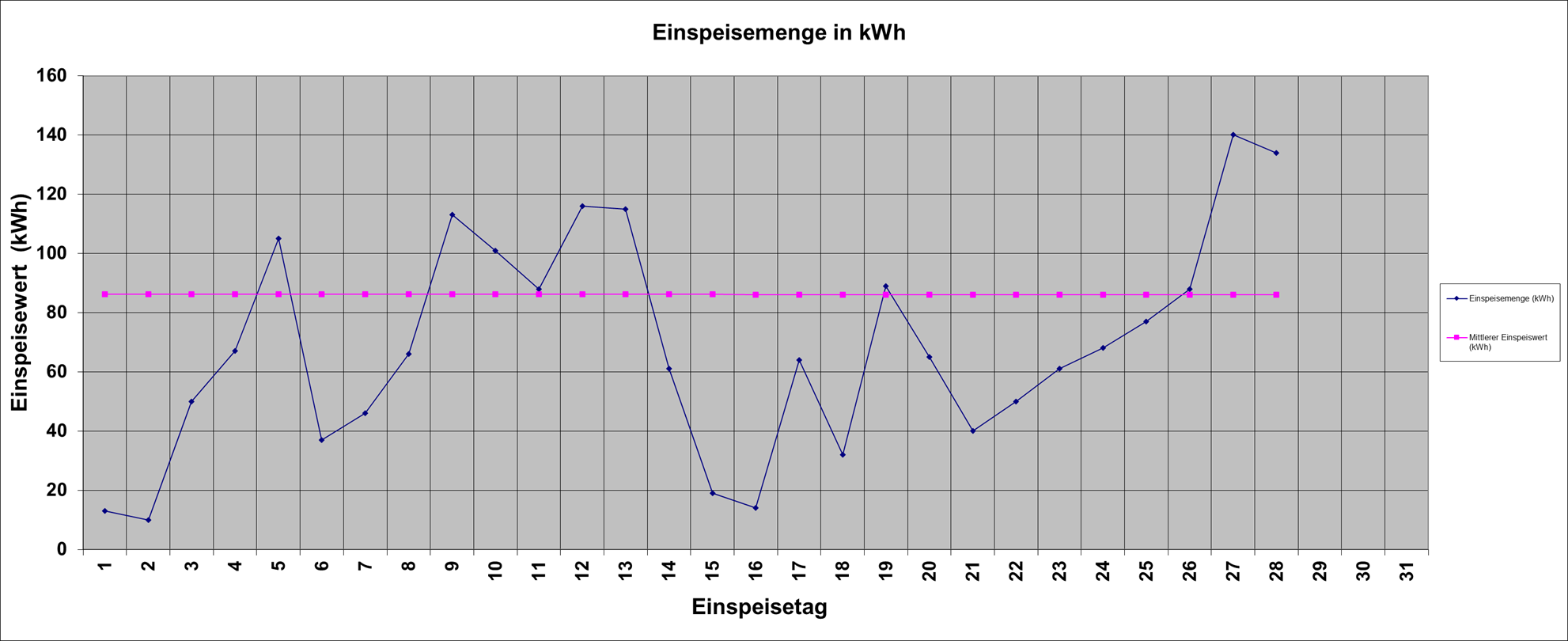 | Einspeisemenge (kWh) | 13 | 10 | 50 | 67 | 105 | 37 | 46 | 66 | 113 | 101 | 88 | 116 | 115 | 61 | 19 | 14 | 64 | 32 | 89 | 65 | 40 | 50 | 61 | 68 | 77 | 88 | 140 | 134 | ||||