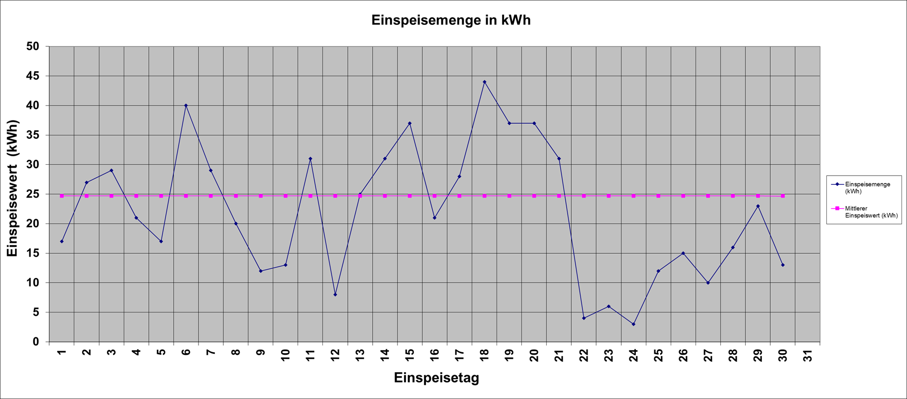 | Einspeisemenge (kWh) | 17 | 27 | 29 | 21 | 17 | 40 | 29 | 20 | 12 | 13 | 31 | 8 | 25 | 31 | 37 | 21 | 28 | 44 | 37 | 37 | 31 | 4 | 6 | 3 | 12 | 15 | 10 | 16 | 23 | 13 | ||