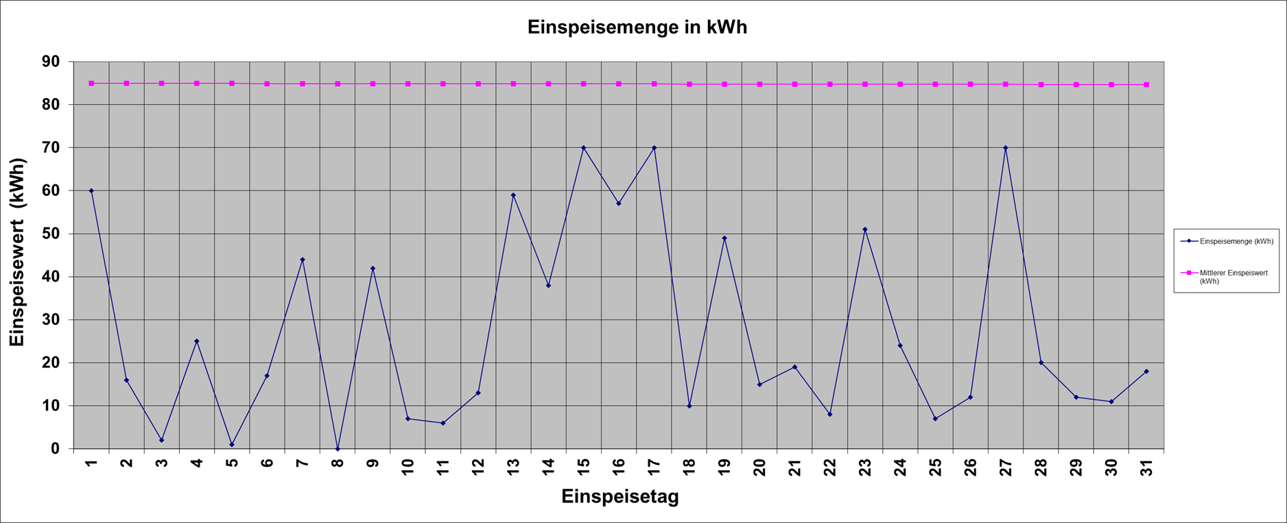 | Einspeisemenge (kWh) | 60 | 16 | 2 | 25 | 1 | 17 | 44 | 0 | 42 | 7 | 6 | 13 | 59 | 38 | 70 | 57 | 70 | 10 | 49 | 15 | 19 | 8 | 51 | 24 | 7 | 12 | 70 | 20 | 12 | 11 | 18 | |